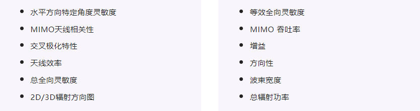 支持3GPP、CTIA等國際標準測試方法和所有測量指標,包括方向圖、增益、效率等天線指標;TRP、TIS、EIRP、EIS、Desense等射頻指標;以及MIMO吞吐率等性能指標。